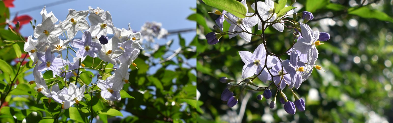 名・由来 | 学名 Solanum jasminoides jasminoides(ソケイ属に似た)Solanum(ナス属) Solanumは、「solamen(安静)」が語源。 ナス科 ナス属 |