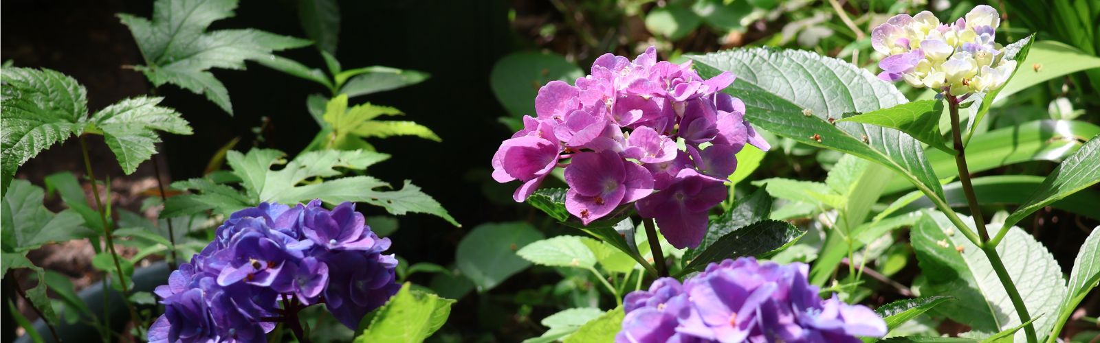和名 紫陽花 (日陰の紫陽花は枝を伸ばし、太陽を仰ぎ見るように咲きます。陽を見る紫の花―まるでアマテルと瀬織津姫のようです)