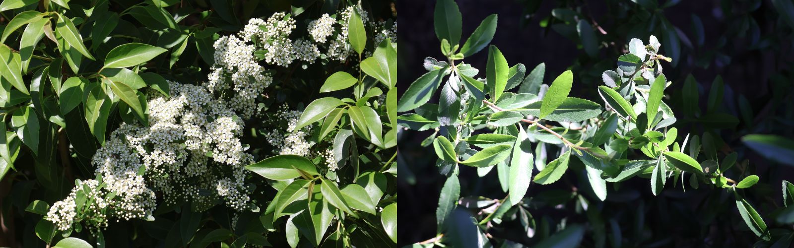| 葉/実 | 葉:濃緑色で光沢がある 実:青酸配糖体(アミグダリン)が、特に”仁”の部分に多く含まれている→エムルシンという酵素で分解され、冬には無害になる。野鳥がピラカンサの実を食べるのが1-2月。 |